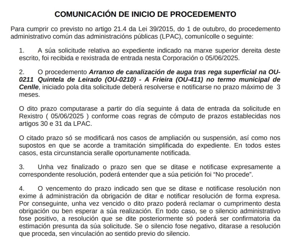 Respecto a la canaleta, el 9 de junio de 2025 recibimos una notificación de la Diputación de Ourense en la que decían que se había registrado la denuncia y que el Concello de Cenlle tenía 3 meses para responder.