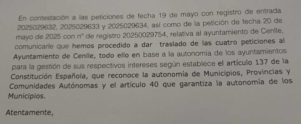 Por otra parte, recibimos una respuesta en español en la que decía que mandaban estas 4 reclamaciones al Ayuntamiento de Cenlle amparándose en las leyes que defienden la autonomía de municipios.